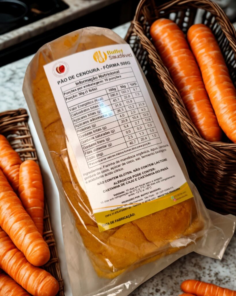 Ingredientes: farinha de mandioca panificável orgânica, cenoura natural, gordura de coco, sal marinho, açúcar de coco, água, fermento biológico e acidulante ácido cítrico.