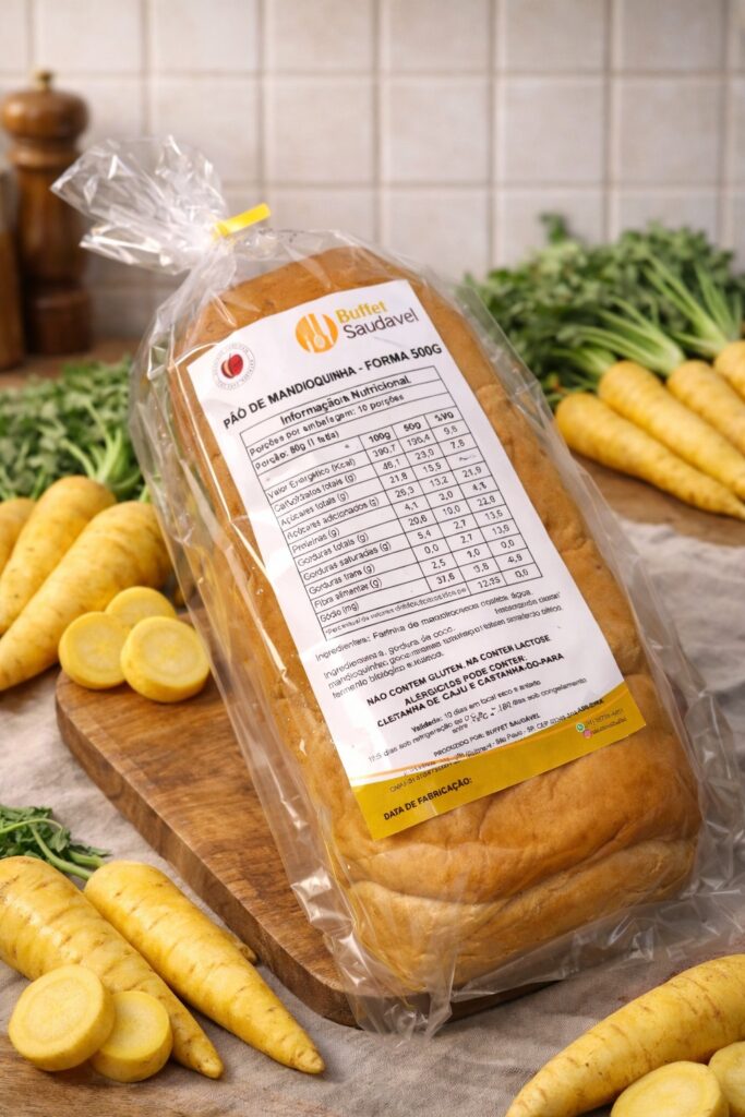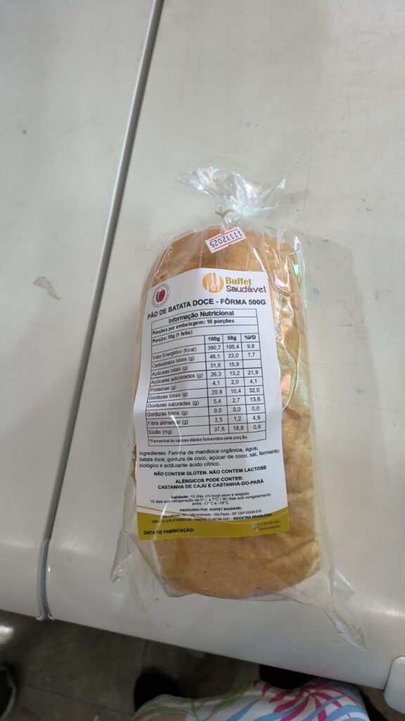 Ingredientes: farinha de mandioca panificável orgânica, batata-doce natural, gordura de coco, sal marinho, açúcar de coco, água, fermento biológico e acidulante ácido cítrico.