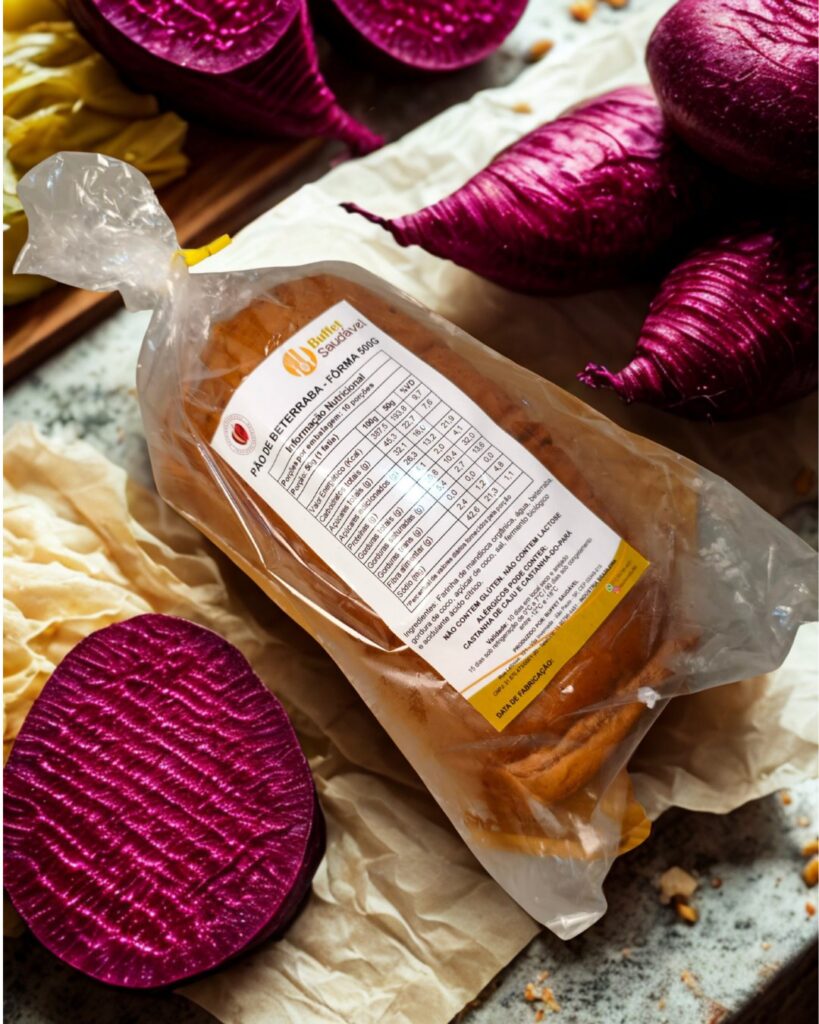 Ingredientes: farinha de mandioca panificável orgânica, beterraba natural, gordura de coco, sal marinho, açúcar de coco, água, fermento biológico e acidulante ácido cítrico.